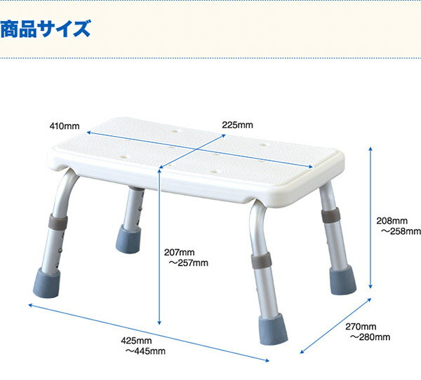 浴槽への出入りをサポートするシャワーステップ!浴槽内のイスとしても最適! シャワーステップ 3段階高さ調整 商 品 詳 細 サ イ ズ(約) 最大時 : 幅445mm×奥行280mm×高さ258mm 最小時 : 幅425mm×奥行270mm×高さ208mm 座面の高さ(約) 3段階調節 (207mm/232mm/257mm) 材 質 座面 : ポリエチレン フレームパイプ : アルミニウム 高さ調整ボタン : ステンレス パイプキャップ : ポリプロピレン 脚ゴム : E-SBR(乳化重合スチレン・ブタジエンゴム) 重 量(約) 1.3kg 最大使用者体重 100kg未満 特 記 事 項 ※こちらの商品は、付属の工具にてお客様組み立てとなります。
