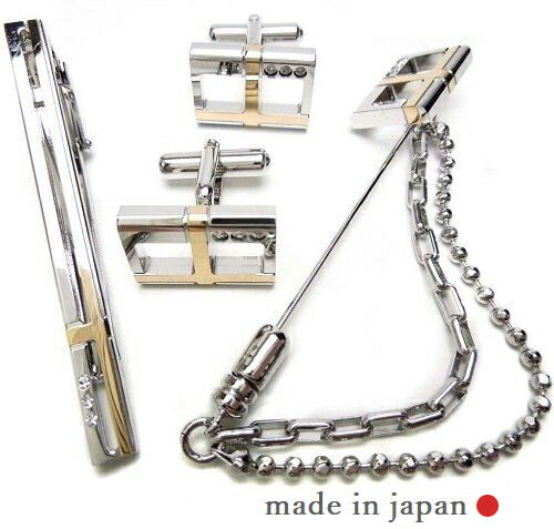 ラペルピン/チェーン付き/メンズ/カフス タイピン ラペルピンセット/3点セットCTR-SET-61シルバー/ クリスタル/ スワロフスキ/ クリアー/ ゴールドカフスボタン カフリンクス ネクタイピン日本製