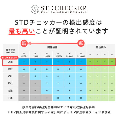 (全ての項目をまとめて受けていただくタイプですので、ご注意ください) 精度の高い検査を提供いたします STDチェッカーの検出感度は、他社と比較して最も高いことが証明されています 郵送検査会社6社(2017年に年間1000件以上のHIV検査実績のある会社)に厚生労働省研究班が、検査精度のブラインド調査を実施したところ、STDチェッカーの検出感度が1番高いことが証明されました。