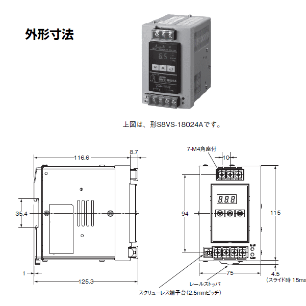外付けダイオード必要) [リモートセンシング] なし [適用規格(UL)] 規格番号: UL Listed: UL508 (Listing) / UL UR: UL60950-1 (Recognition) [適用規格(CSA)] 規格番号: cUL: CSA C22.2 No.107.1 / cUR: CSA C22.2 No.60950-1 [適用規格(EN)] EN50178 / EN60950-1 [適用規格(EC指令(EMC指令))] 放射妨害電界強度: EN61204-3 Class A 適合 雑音端子電圧: EN61204-3 Class A 適合、FCCクラスA 準拠 高調波電流: EN61000-3-2 EMS: EN61204-3 High severity levels [適用規格(VDE)] VDE0160 / VDE0805 Teil 1 [適用規格(SEMI)] F47-0200(AC200V入力時) [適用規格(その他)] 韓国Sマーク [周囲温度範囲] 使用時: -10〜60℃(ディレーティング曲線参照) 保存時: -25〜65℃(ただし、氷結、結露しないこと) [周囲湿度範囲] 使用時: 25〜85% RH 保存時: 25〜90% RH(ただし、氷結、結露しないこと) [耐電圧] (入力一括)と(出力一括・アラーム出力一括)間: AC 3kV 1min (検出電流20mA) (入力一括)と(PE)間: AC 2kV 1min (検出電流20mA) (出力一括・アラーム出力一括)と(PE)間: AC 1kV 1min (検出電流20mA) (出力一括)と(アラーム出力一括)間: AC 500V 1min (検出電流20mA) [絶縁抵抗] (出力一括・アラーム出力一括)と(入力一括・PE)間: 100MΩ以上 (DC500Vにて) [耐振動] 10〜55Hz 片振幅 0.375mm 3方向 各2h [耐衝撃] 150m/s**2、6方向 各3回 [出力表示灯] あり(色:緑) [冷却方式] 自然空冷 [構造] カバー付タイプ [端子台タイプ] ネジ端子 [取りつけ] DINレール取りつけタイプ [質量(本体)] 約850g
