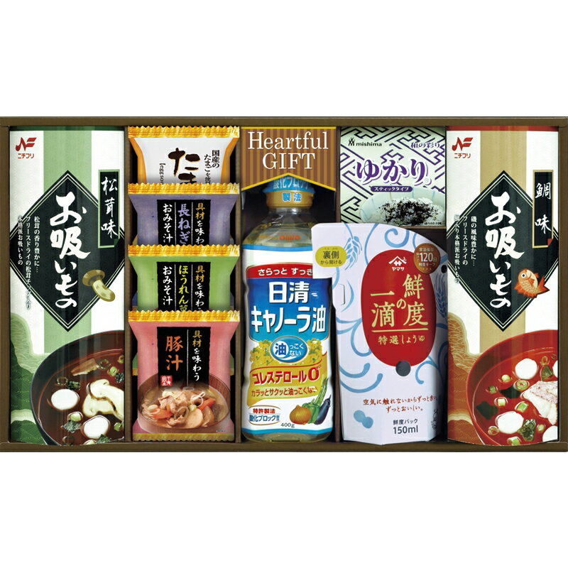 日清キャノーラ油&鮮度の一滴しょうゆ詰合せ 調味料 詰合せ セット 三島ゆかり ニチフリお吸い物松茸味 ニチフリお吸い物鯛味 具材を味わうおみそ汁 豚汁 ほうれん草 長ねぎ たまごスープ 結婚祝い 引き出物 引っ越し 引越し お中元 お歳暮 新築祝 お返し ご挨拶 ギフト