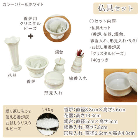 どんなお部屋・仏具にもあわせやすいミニ仏壇・ステージタイプにパールホワイトの仏具セットをお付けしてお届けします。