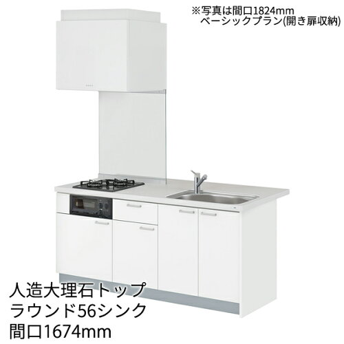 【ワークトップ】人造大理石トップ ベーシックホワイト 【シンク】ステンレス ラウンド56シンク 【水栓金具】シングルレバー水栓 ノルマーレS・エコハンドル 【食洗機】なし 【加熱機器】2口コンロ・ホーロートップタイプ グリル付 【ウォールユニット】なし 【レンジフード】サイドマントルCARタイプ ホワイト 【その他】ジャバラホース排水セットセンターキッチン用ガラスパネル