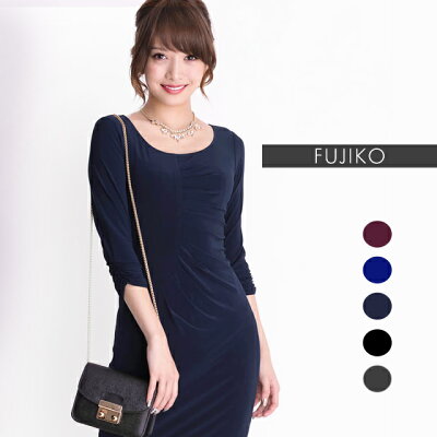 不二子ワンピ:無地 ワンピース ◆opn050001七分袖 ジャージーワンピース タイト 膝丈 S-M-L-XL トールサイズ エレガント オフィス 着やせ 大きいサイズ フォーマル 30代 40代 春 夏 秋 冬 婚活 同窓会 結婚式 シンプル FUJIKO フジコ