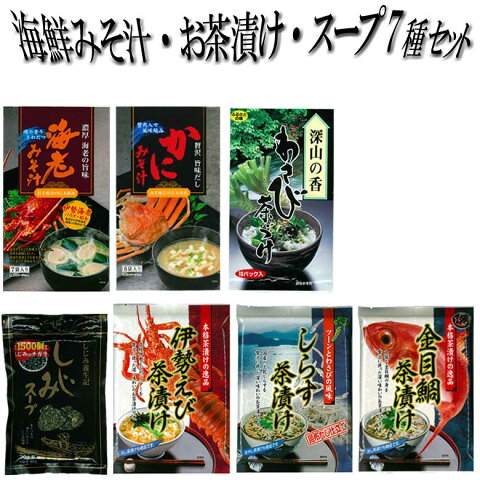 ◆同梱発送でお得にお買い物!◆ 商品名 みそ汁・お茶漬け・スープ7種セット 名称 即席みそ汁(粉末状)・乾燥スープ 原材料・内容量 海老みそ汁7食(72.1g 10.3g×7袋):粉末味噌(米味噌、デキストリン、食塩、鰹節)、乾燥えび、折り麩(小麦由来)、乾燥わかめ、ひとえ草、食塩、乾燥ねぎ(ねぎ、麦芽糖)、伊勢海老(国産:製品中配合比1%)、アメリカイセエビ、乾燥シャロット、唐辛子パウダー、調味料(アミノ酸等)、酸化防止剤(ビタミンE) カニ味噌汁(54g 9g×6袋):かに顆粒(かに、食塩、食用油脂、人参、玉ねぎ、魚醤、唐辛子、)粉末味噌(米味噌、デキストリン、食塩、鰹節)、乾燥パプリカ(パプリカ、ぶとう糖、醸造酢、食用油脂)、かに殻粉末、乾燥油揚げ、乾燥豆腐、かに肉、乾燥ねぎ(ねぎ、麦芽糖)ぶどう糖、食塩、調味料(アミノ酸等)、ふくらし粉、とうふ用凝固剤、酸化防止剤(ビタミンE)、ph調整剤 イセエビ茶漬け(40g 5g×8包):えび粉末(伊勢えび殻粉末25%)、食塩、あられ、砂糖、みつば、海苔、コーンスターチ、青のり、粉末抹茶、乳糖、昆布抹茶、調味料(アミノ酸等)、着色料(クチナシ、紅花黄)、(原材料の一部にえび、乳を含む) ワサビ茶漬け10食(60g 6g×10袋):あられ、食塩、海苔、野沢菜、乳糖、砂糖、ぶどう糖、三つ葉、鰹節、抹茶、わさび、鰹節エキスパウダー、醤油、生姜、鯖節、酵母エキスパウダー、昆布粉末、椎茸粉末、調味料(アミノ酸等)、香料 金目鯛茶漬け(40g 5g×8包):食塩、砂糖、あられ、鯛(金目鯛40%)、白ごま、のり、乳糖、コーンスターチ、デキストリン、青のり、みつば、抹茶粉末、昆布粉末、魚介エキス、粉末醤油、調味料(アミノ酸等)、着色料(クチナシ、紅花黄、カラメル)、酸化防止剤(ビタミンE)、(原材料の一部に小麦、乳、大豆を含む) イセエビ茶漬け(40g 5g×8包):えび粉末(伊勢えび殻粉末25%)、食塩、あられ、砂糖、みつば、海苔、コーンスターチ、青のり、粉末抹茶、乳糖、昆布抹茶、調味料(アミノ酸等)、着色料(クチナシ、紅花黄)、(原材料の一部にえび、乳を含む) ワサビ茶漬け10食(60g 6g×10袋):あられ、食塩、海苔、野沢菜、乳糖、砂糖、ぶどう糖、三つ葉、鰹節、抹茶、わさび、鰹節エキスパウダー、醤油、生姜、鯖節、酵母エキスパウダー、昆布粉末、椎茸粉末、調味料(アミノ酸等)、香料 ワサビ茶漬け10食(60g 6g×10袋):あられ、食塩、海苔、野沢菜、乳糖、砂糖、ぶどう糖、三つ葉、鰹節、抹茶、わさび、鰹節エキスパウダー、醤油、生姜、鯖節、酵母エキスパウダー、昆布粉末、椎茸粉末、調味料(アミノ酸等)、香料 しじみスープ80g:食塩、乳糖、醤油(小麦を含む)、還元水飴、オルニチン塩酸塩、砂糖、ぶどう糖、しじみエキス、生姜、麦芽糖、具(わかめ、しじみ、ねぎ)調味料(アミノ酸等)、酸化防止剤(ビタミンE) *本商品の製造ラインでは乳、卵、小麦、えび、かにを含む製品を生産しています。