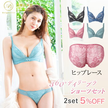 Angellir 360°デイリーブラ&ヒップレースショーツセット 2セット ノンワイヤー ダブルフロントホック 脇スッキリ 背中 脇肉 ブラジャー ナイトブラ ルームブラ