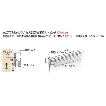 商品名 HPO-K ポスターレールKタイプ 1200mm 品番 HPO-K1200 寸法 14mm x 37mm 長さ 1200mm 材質 本体 アルミ押出型材 カバー及びキャップ 樹脂 表面 本体 アルマイトシルバー カバー及びキャップ ホワイト 設置方法 壁面設置タイプ 推奨紙厚 0.1〜0.3mm 付属品 ポスターレールx1 レールキャップx2個(左右) 両面テープx5枚 納期 通常2〜3営業日ほどで発送可能です 返品・交換 こちらの商品は返品・交換が不可となります 備考 ・ポスターレールには、予めビス穴は明いておりませんので、 ビスで固定する際には、ビス穴を明けていただく必要がございます (300mmピッチ以内) ・取付には壁面などの強度を確認してご使用ください、強度不足の場合には必ず補強をしてください ・別売でマグネットシートもございます